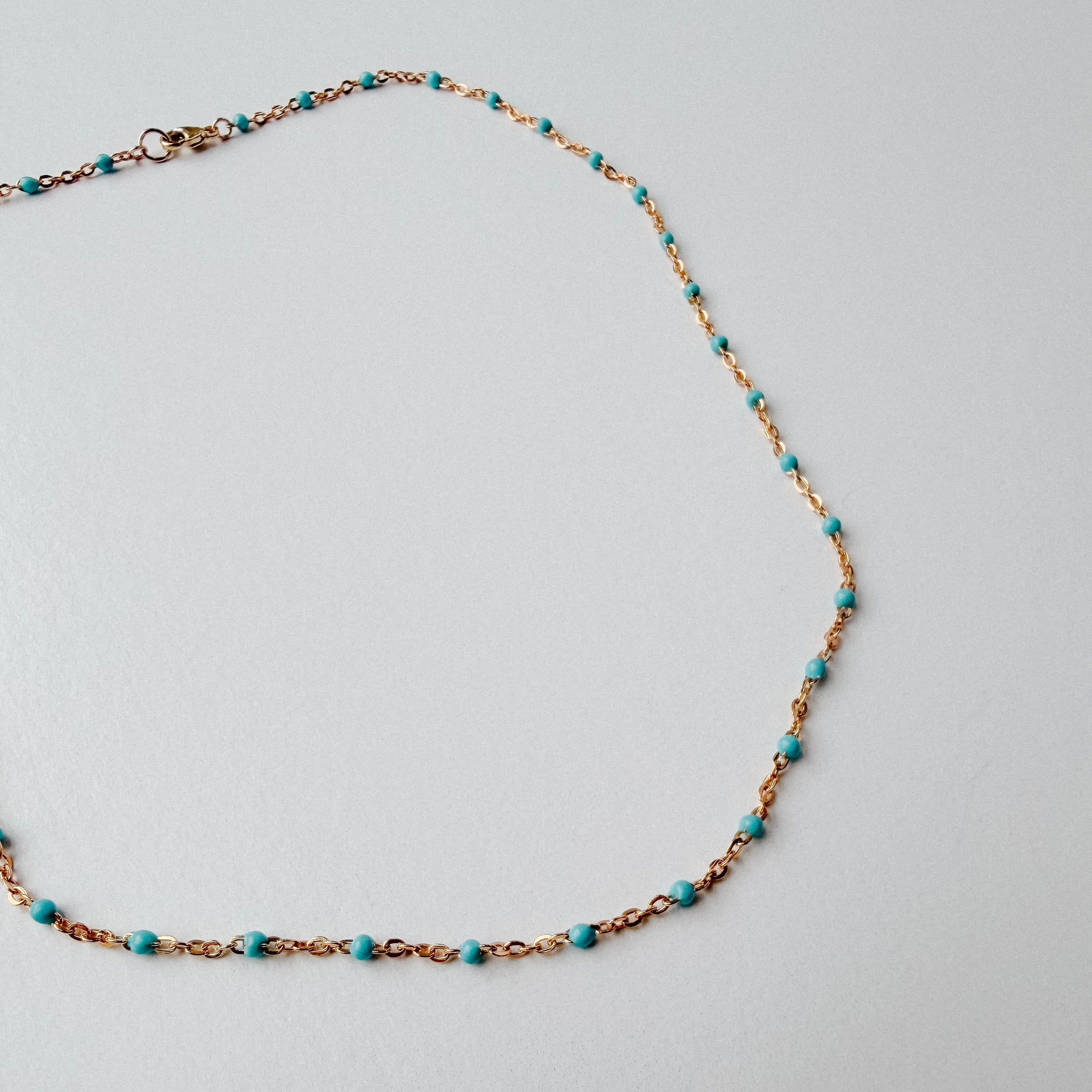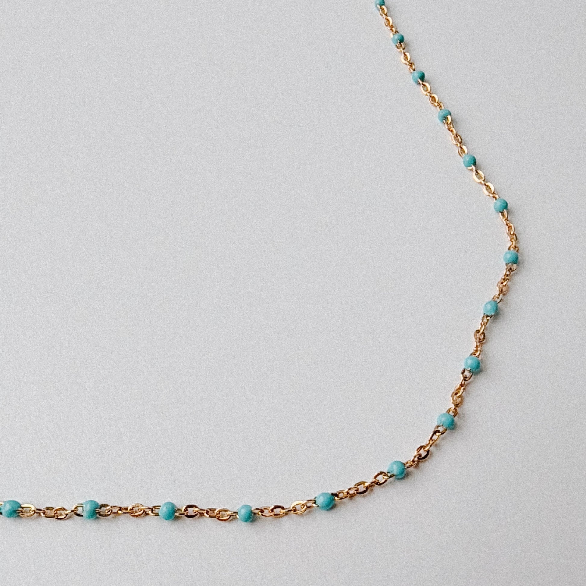 - 14” dainty, gold filled chain with turquoise enamel beads and a lobster clasp closure